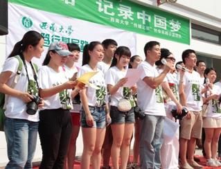 接下來他們將分散調(diào)研,通過拍攝和征集100組生動、鮮活、感人的“老百姓的中國夢”圖片,傾聽、記錄、分析老百姓對“中國夢”的理解,以及對地方發(fā)展的建議和對城市建設(shè)的意見...詳情>>> 7月4日上午,熱情盛夏,流光溢彩。歇馬鎮(zhèn)碚青路中心廣場上人頭攢動、歌聲飛揚、掌聲不斷、熱鬧非凡。西南大學“傳媒之眼”服務(wù)隊的志愿者同學在這里舉行“篤行基層路,記錄中國夢”為主題的文藝匯演。