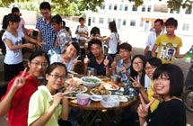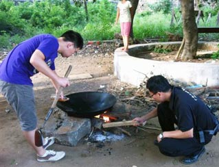 在三教村,志愿者受到了當(dāng)年解放軍進城的待遇。由于小學(xué)在施工不便住宿,村民便打開自家新裝修的房子請隊員們住。接著隊員們到露天廚房大展身手,灶臺是由幾個石頭和一個大鐵鍋搭建而成。指導(dǎo)老師看大家興致高,也過來起火,燒柴。有天傍晚,烏云密布,眼瞅著雨就要掉下來,為了能讓志愿者們下雨前吃到飯,熱心的村民為志愿者們買醬料,給他們燒起了飯。