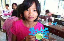 活動現(xiàn)場,孩子們盡情發(fā)揮自己的想象,用有限的廢紙、易拉罐等廢棄材料創(chuàng)造出了各種富有特色的手工藝作品。許多學(xué)生的創(chuàng)意作品超出了隊員們的想象,隊員們?nèi)滩蛔∨氖纸泻。雷州市烏石?zhèn)三教小學(xué)六年級學(xué)生用日常可見的易拉罐瓶設(shè)計出簡易的小垃圾桶。將平凡的垃圾桶擬人化,還在設(shè)計出來的垃圾桶上寫著“保護環(huán)境、愛護家園”等標(biāo)語。二年級學(xué)生設(shè)計出的綠色太陽花,說那是一朵綠花,那是一個希望。