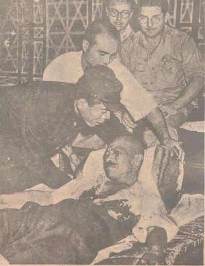 1945年8月,日本無條件投降后不久,東條英機自知罪責(zé)難逃,舉槍自殺。圖示他中彈獲救時之痛苦情狀。作為頭號戰(zhàn)犯,他在獲救后仍被送上絞刑架。三絞廢命。
