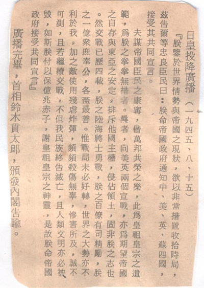 1945年8月15日日本天皇投降廣播詞。這篇文告是告訴自己的老百姓(忠良臣民)的。其中對于發(fā)動戰(zhàn)爭的罪責(zé)不但沒有一個字的自責(zé),而且指“敵使用殘虐炸彈,頻頻殺傷無辜,慘害所及,誠不可測。”和十余年后所發(fā)現(xiàn)的東條英機遺囑的惡劣態(tài)度如出一轍。廣大網(wǎng)友不放回頭看看2013年12月12日18:21:31《歷史鐵證日本400年侵華野心,讓我們恨搗靖國神社內(nèi)幕吧!》一文中東條英機的遺囑。