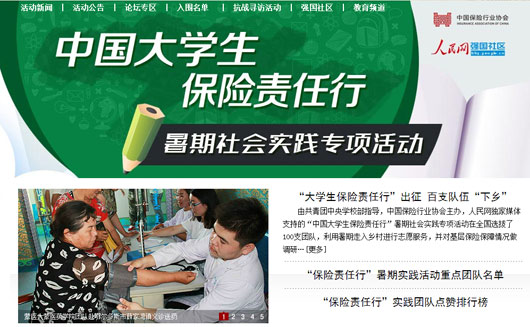 本次活動從全國27個省市100多所高校選拔出100支入圍團隊,在暑期分別以支教、環(huán)保、醫(yī)療、調(diào)研等形式服務(wù)鄉(xiāng)村,提高當(dāng)?shù)鼐用癜踩庾R,提升社會對安全教育問題的關(guān)注,同時開展調(diào)研,了解基層保險保障相關(guān)情況。各團隊實踐期間在人民網(wǎng)強國社區(qū)活動專區(qū)實時播報實踐進程,發(fā)回稿件數(shù)千篇。大學(xué)生們積極走入社會、服務(wù)基層的實際行動贏得50萬網(wǎng)友為他們“點贊”。
