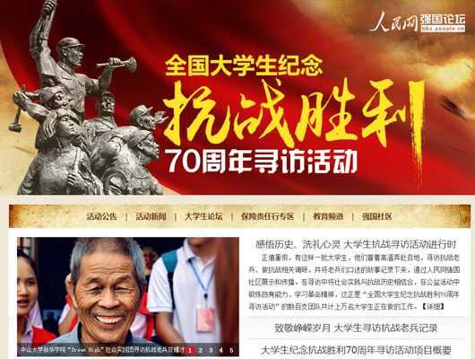 本次活動吸引了來自全國200多所高校的800支大學(xué)生團(tuán)隊報名,大學(xué)生們尋訪抗戰(zhàn)老兵,聆聽抗戰(zhàn)故事,重走抗戰(zhàn)遺址,調(diào)研人文歷史,感悟革命精神。各團(tuán)隊實踐期間在人民網(wǎng)強(qiáng)國社區(qū)大學(xué)生論壇實時播報實踐進(jìn)程,發(fā)回稿件數(shù)千篇。浙江大學(xué)一位學(xué)生在實踐總結(jié)中說:“我們的活動通過人民網(wǎng)的平臺得到了更多媒體的關(guān)注,讓更多的人關(guān)注到關(guān)愛抗戰(zhàn)老兵行動,這個暑假沒有白過,真的很有意義!”