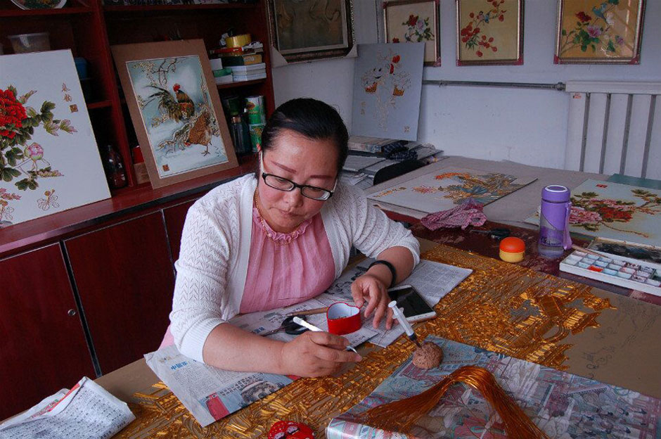 正在制作一帶一路主題掐絲畫的高芬平