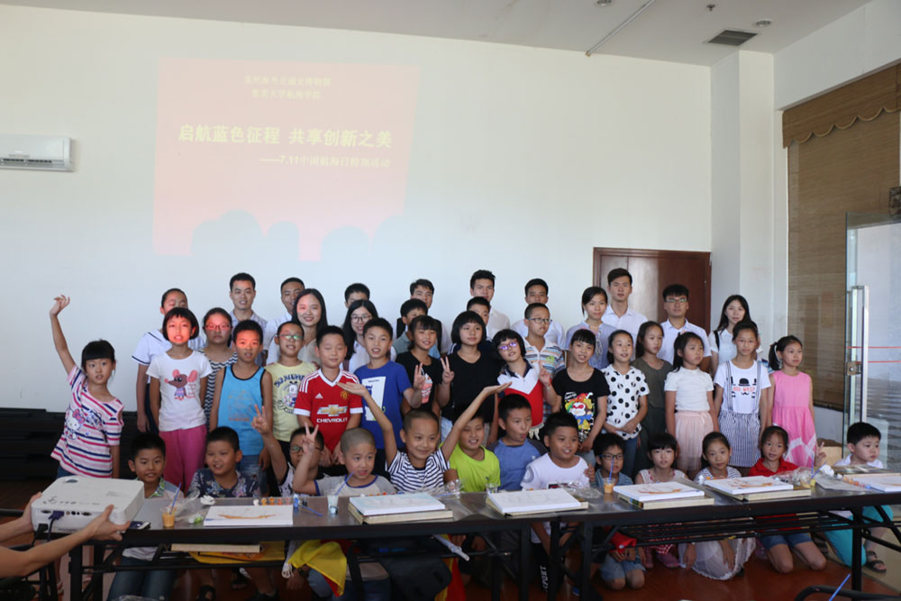 實(shí)踐隊(duì)與泉州海外交通史博物館共同開展了“啟航藍(lán)色征程,共享創(chuàng)新之美——7.11中國(guó)航海日”特別活動(dòng),向30位小朋友講解航海小知識(shí),介紹古老的旗語和莫爾斯電碼等!跋M覀兊暮胶N幕軌騻鞑コ鋈,從娃娃抓起” 隊(duì)長(zhǎng)胡栩禎說。