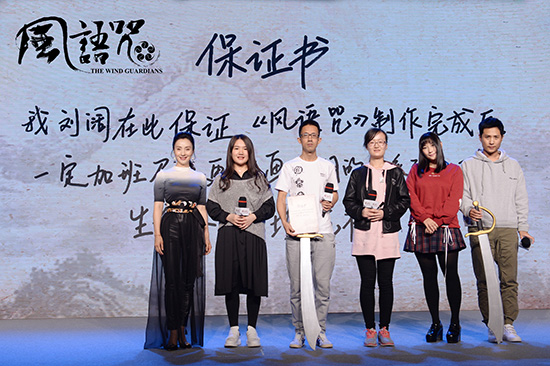 發(fā)布會現場,導演劉闊收到了來自粉絲扛來的“刀片”,簽下“按時更新保證書”。出品人陶虹自曝自己是“畫江湖”系列的忠實粉絲,此次參與滿足了作為一個粉絲的“私心”,F場,她和知名配音演員邊江、山新演繹了《風語咒》人物經典之聲,嗨爆全場。