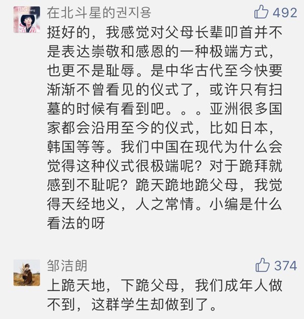 此類“跪拜感恩儀式”此前也多次見諸媒體。有人認(rèn)為憑借“跪拜父母”這樣一個(gè)古樸而鄭重的形式,可以倡導(dǎo)日益淡薄的感恩文化回歸,也有網(wǎng)友認(rèn)為“孝道在心,不在做秀”,或從人格養(yǎng)成方面評(píng)論:“跪拜禮抹殺了獨(dú)立人格”。
