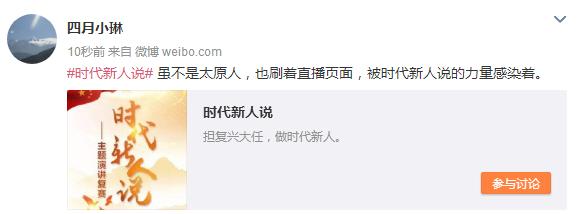 #時代新人說#微博話題下不乏這樣的留言:“太原乃至全國,都被‘時代新人說’刷屏了”、“雖不是太原人,也刷著直播頁面,被時代新人說的力量感染著”。