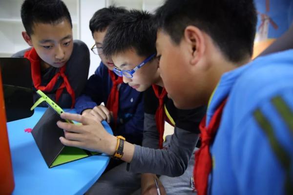 幾位小學(xué)生正在用平板電腦設(shè)計(jì)作品(圖片來源:半月談)