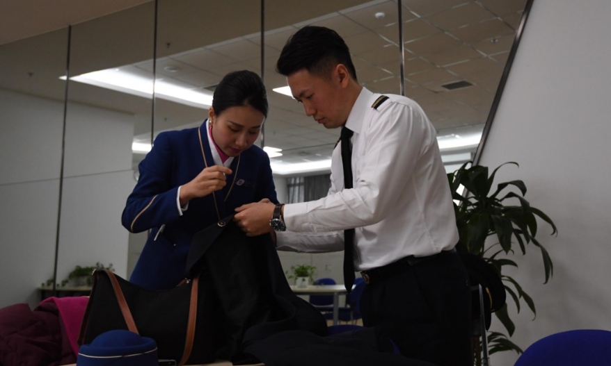 春運(yùn)期間,劉黎(航空安全員)與妻子練黎(乘務(wù)長(zhǎng))一同堅(jiān)守崗位。(新華社)
