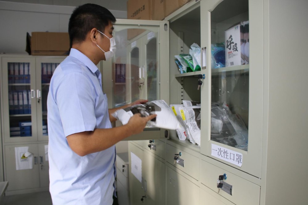 圖為郭衛(wèi)紅為員工發(fā)放防護用品前進行檢查
