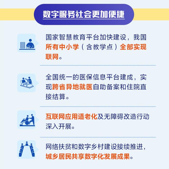 與此同時,《報告》介紹,在數(shù)字服務(wù)社會方面,國家智慧教育平臺加快建設(shè),我國所有中小學(xué)(含教學(xué)點)全部實現(xiàn)聯(lián)網(wǎng)。全國統(tǒng)一的醫(yī)保信息平臺建成,實現(xiàn)跨省異地就醫(yī)自助備案和住院直接結(jié)算;ヂ(lián)網(wǎng)應(yīng)用適老化及無障礙改造行動深入開展。網(wǎng)絡(luò)扶貧和數(shù)字鄉(xiāng)村建設(shè)接續(xù)推進,城鄉(xiāng)居民共享數(shù)字化發(fā)展成果。