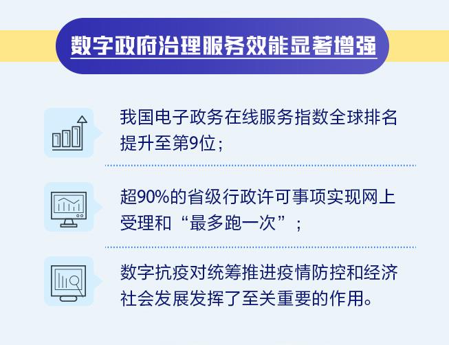 《報告》顯示,我國數(shù)字政府治理服務(wù)效能顯著增強。我國電子政務(wù)在線服務(wù)指數(shù)全球排名提升至第9位;超90%的省級行政許可事項實現(xiàn)網(wǎng)上受理和“最多跑一次”;數(shù)字抗疫對統(tǒng)籌推進疫情防控和經(jīng)濟社會發(fā)展發(fā)揮了至關(guān)重要的作用。