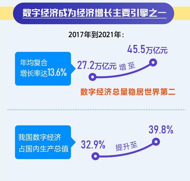 《報告》顯示,2017年到2021年,我國數(shù)字經(jīng)濟規(guī)模從27.2萬億增至45.5萬億元,總量穩(wěn)居世界第二,年均復(fù)合增長率達13.6%,占國內(nèi)生產(chǎn)總值比重從32.9%提升至39.8%,成為推動經(jīng)濟增長的主要引擎之一。