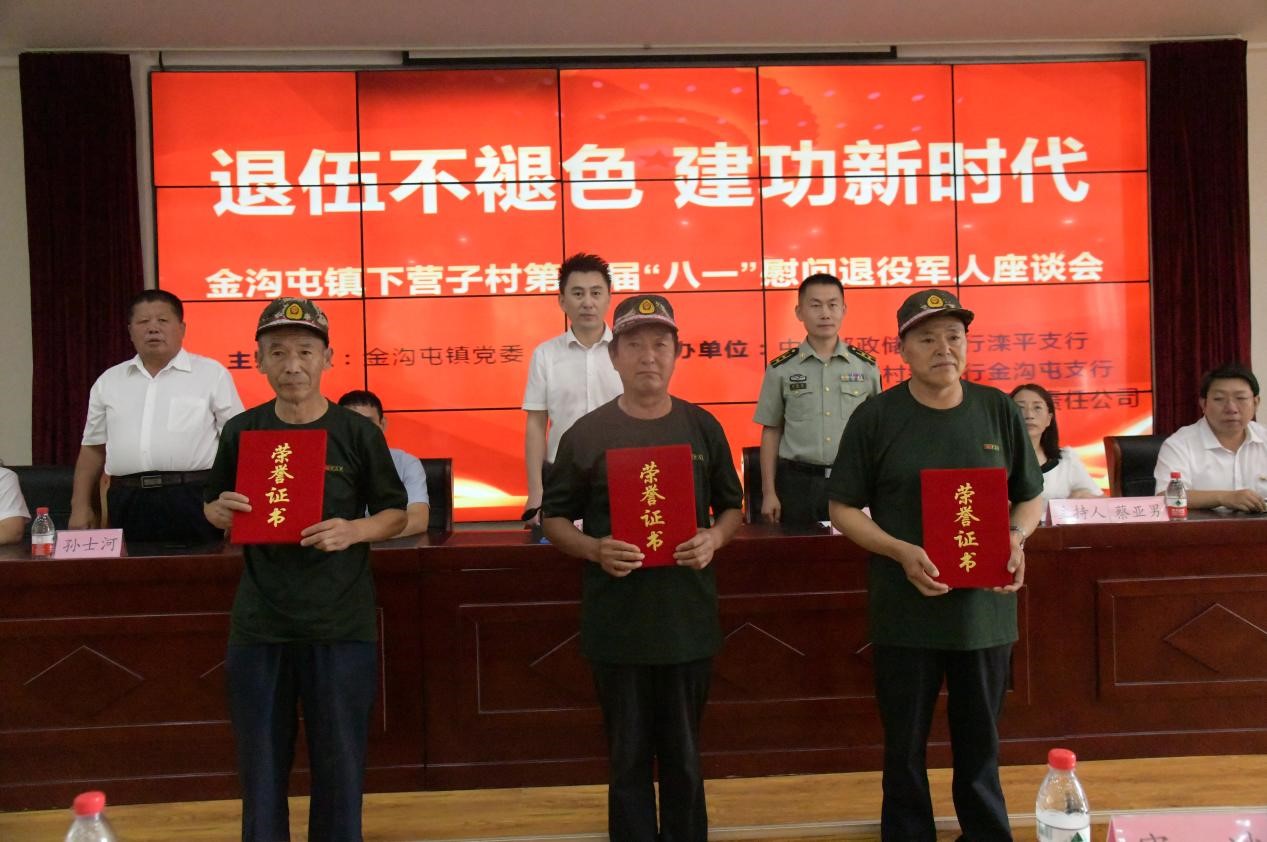8月1日下午,灤平縣金溝屯鎮(zhèn)下營子村聯(lián)合愛心企業(yè)中國郵政儲蓄銀行灤平支行、灤平盛陽村鎮(zhèn)銀行金溝屯支行和承德久財農(nóng)牧開發(fā)有限責(zé)任公司共同舉辦了“退伍不褪色 建功新時代”第二屆“八一”慰問退役軍人座談會;顒蝇F(xiàn)場,大家歡聚一堂,共同慶祝中國人民解放軍建軍95周年,共敘魚水深情,并為優(yōu)秀退役軍人頒發(fā)榮譽證書。 王海琦 郎朗 攝